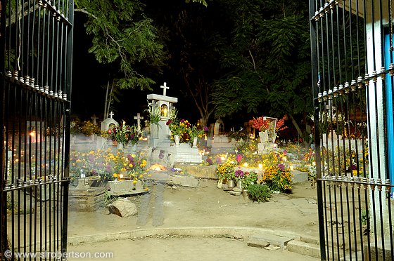 The cemetery is located in this colorful little town surrounded by different shaped houses made out of inconsistent looking bricks, and very colorful. There’s a lot of nature surrounding the houses — plants and beautiful yellow flowers. It’s always sunny and warm. The streets often seem isolated though.